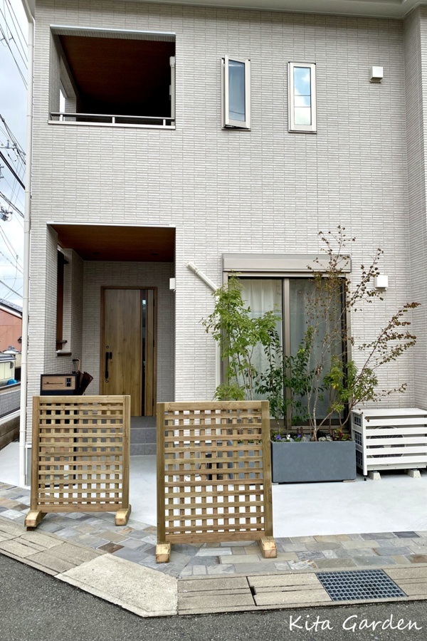 兵庫県川西市で、洗練されたグレーの外構と緑豊かな植栽が美しいエクステリアが完成しました。
