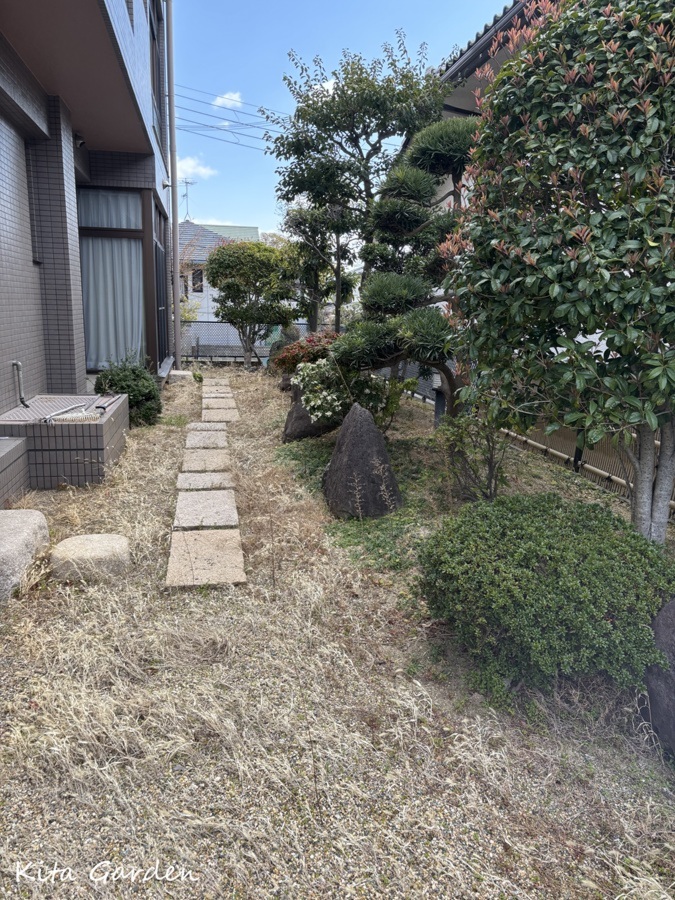 以前は、ご両親が楽しまれていた和風庭園でしたが、床面が舗装されておらず雑草が生え、植木も剪定が必要なものばかりで、管理だけが大変なお庭でした。