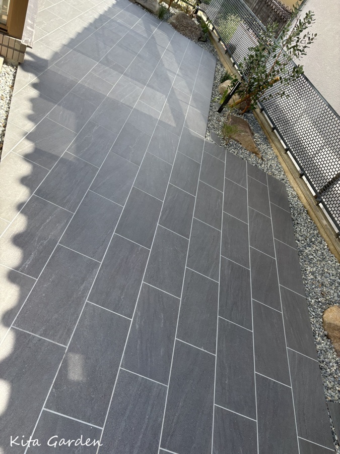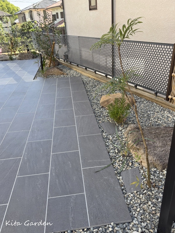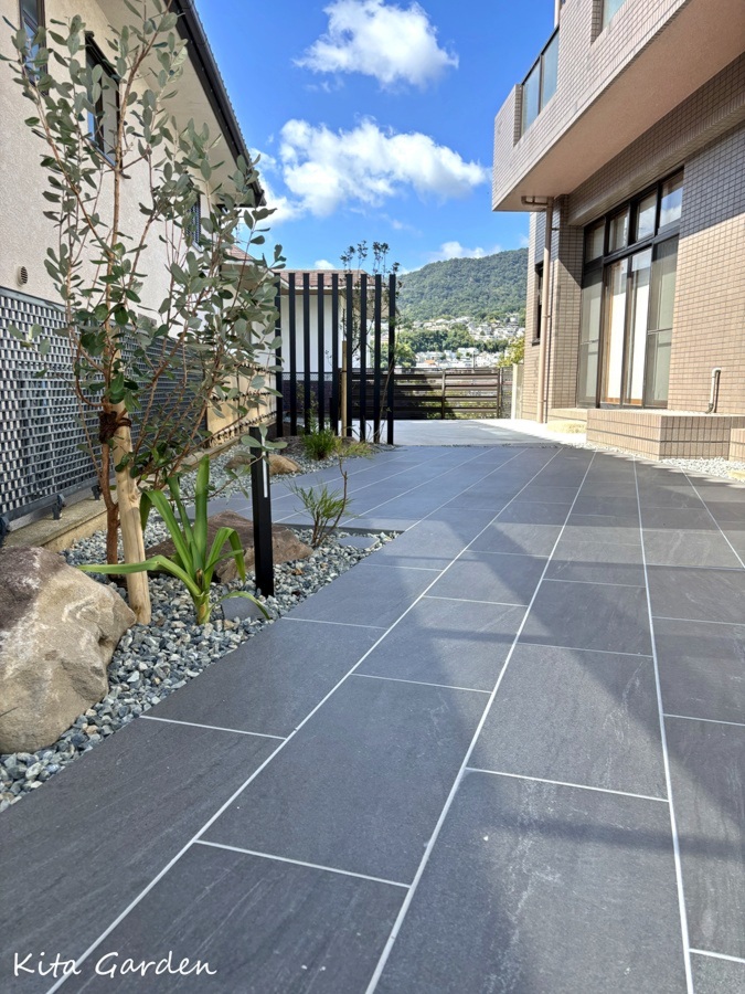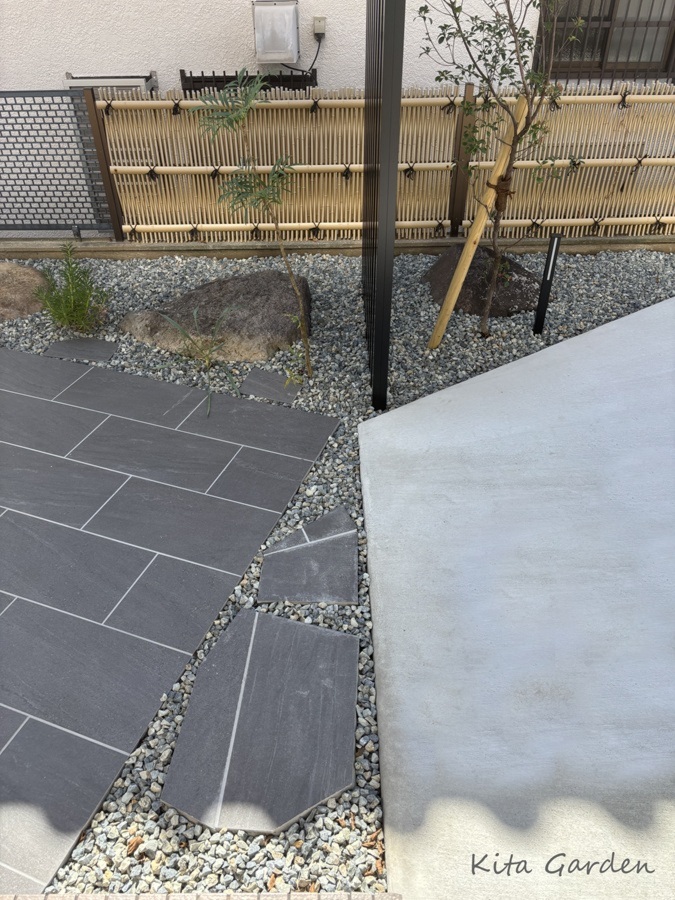タイルと自然石、そして植栽が調和することで、シンプルながらも素材の美しさと奥行きが際立つ上質な空間が完成しました。