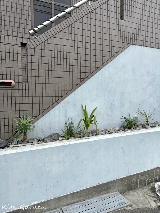 ユッカは大きくなりにくい種類を選び、アガパンサスなどと組み合わせて、シンプルながら動きのあるデザインに仕上げました。