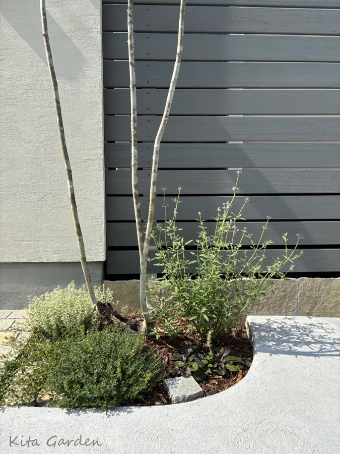 足元にはサルビアやタイムなどのハーブ類を配し、香りと彩りで暮らしに寄り添う植栽としています。