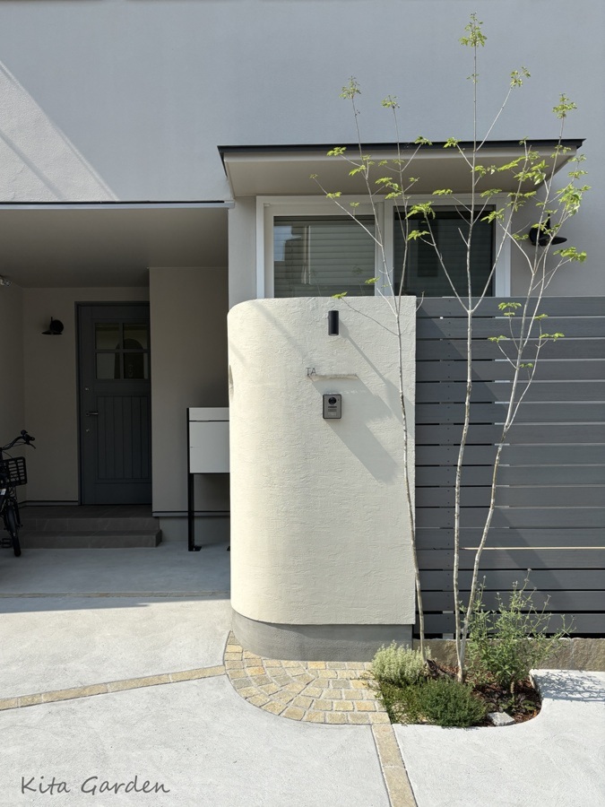 やわらかな色合いがグレーを基調とした外構を引き立て、ナチュラルで上品な印象に仕上がりました。