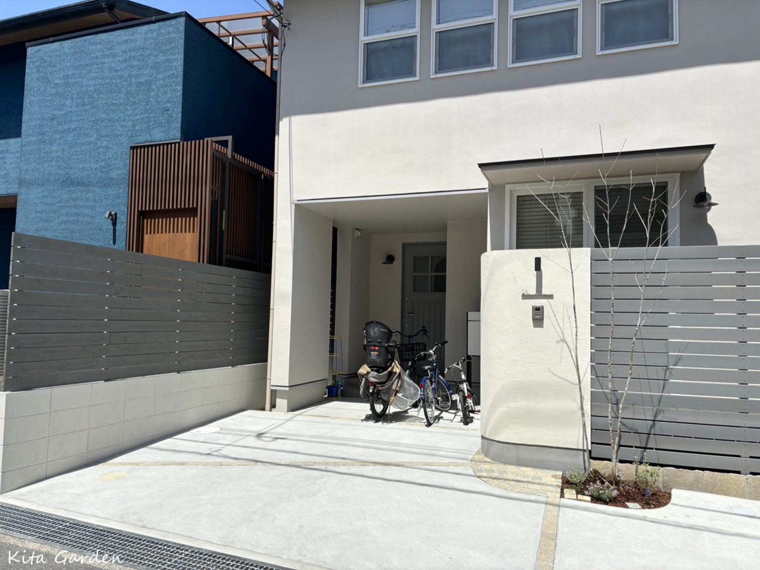 また、自転車と車の動線を考慮し、あえて敷地の中央に門柱を配置。