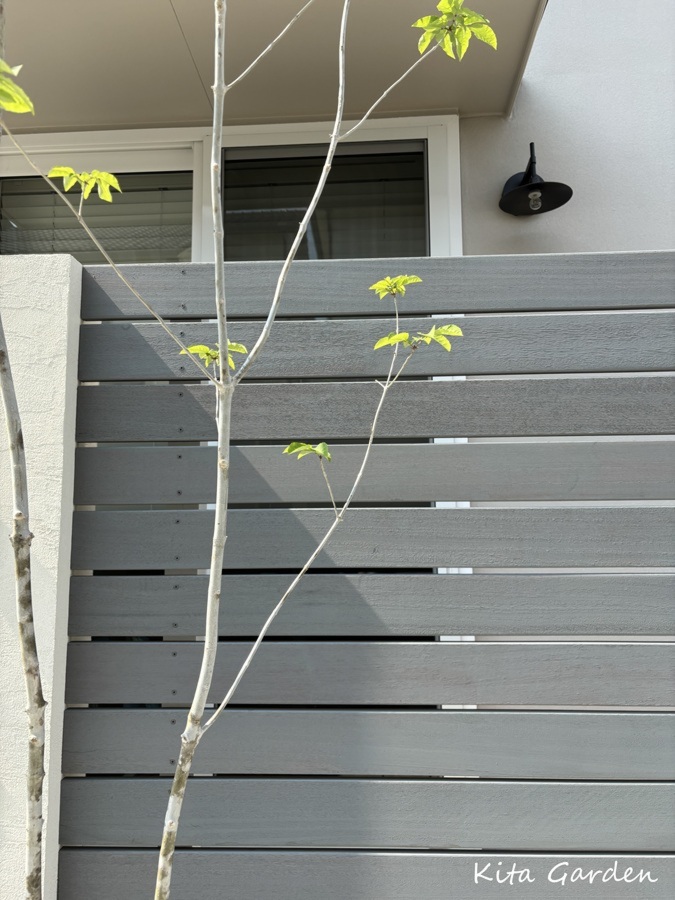 グレーのフェンスを背景に、アオダモの繊細な幹とやわらかな葉が美しい表情を見せています。