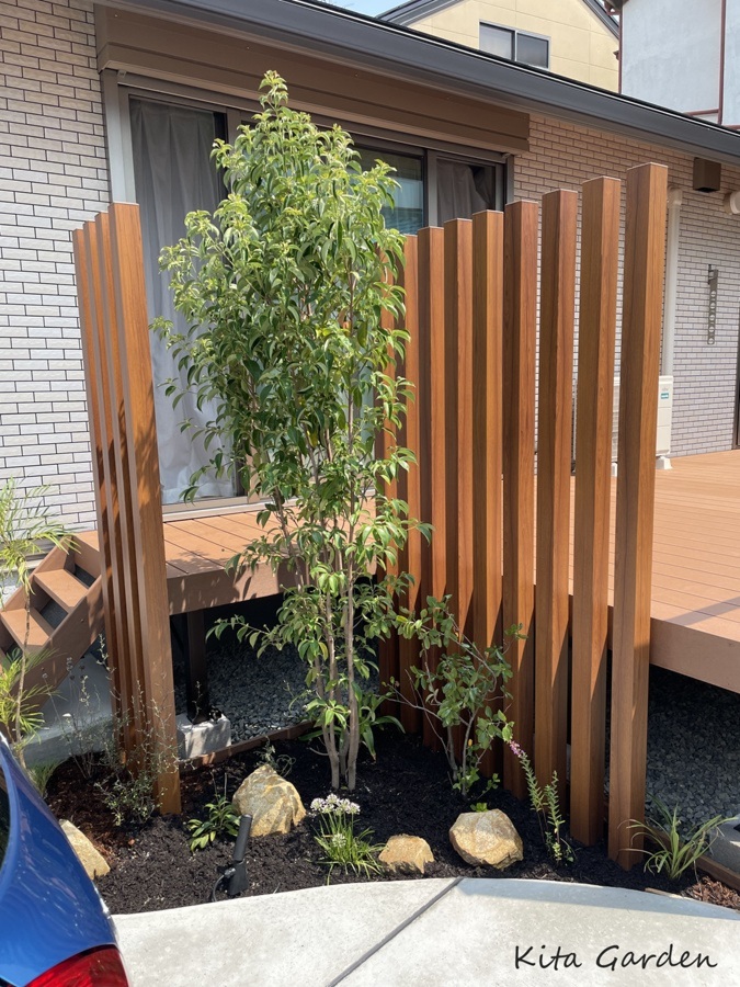 ブラックの木調格子が、植栽の緑をより美しく引き立てます。