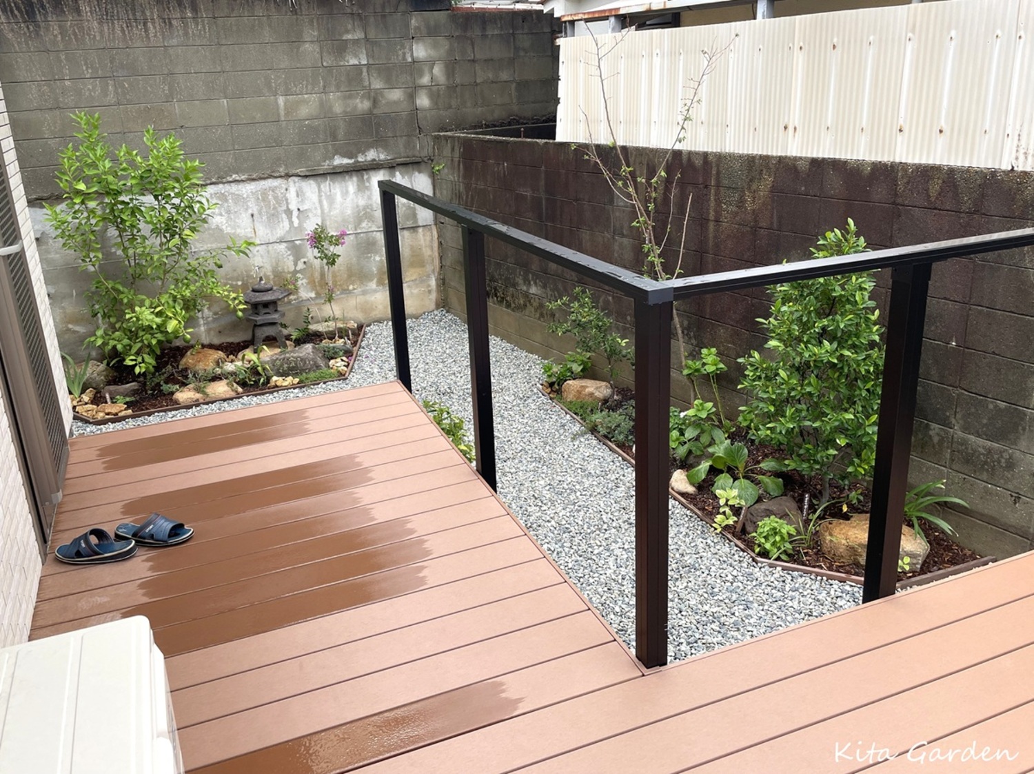 足元の砂利や景石、植栽が織りなす落ち着いた風景を、デッキから眺めて楽しむことができます。