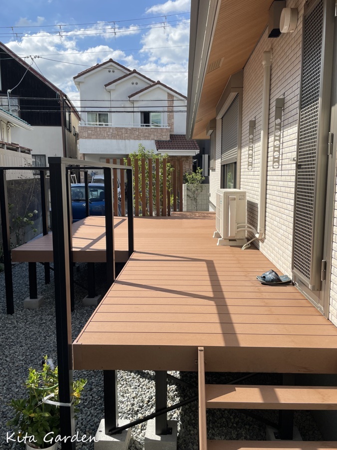 メインのお庭は、来客の方やワンちゃんがゆったりと過ごせる広々としたウッドデッキ。