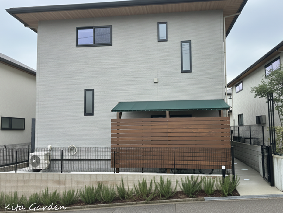 木のフレームと落ち着いたグリーンの屋根が建物と調和し、外構全体の印象もよりやわらかく、温かみのある雰囲気に仕上がりました。