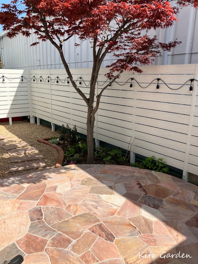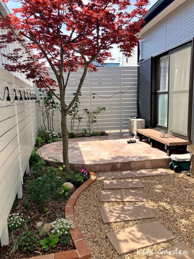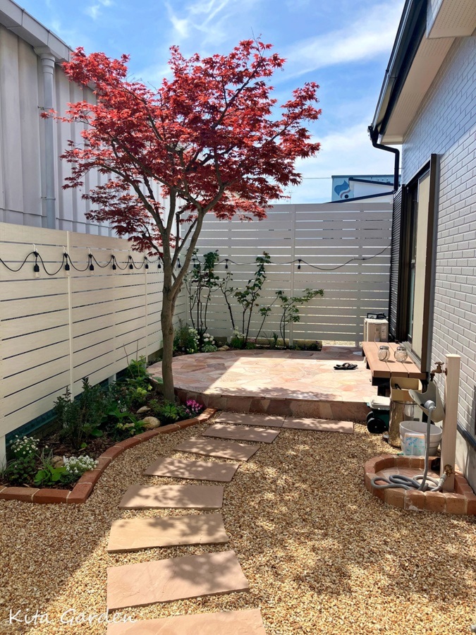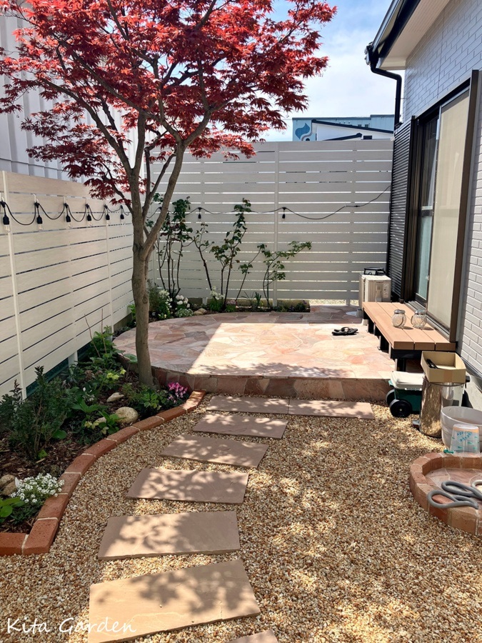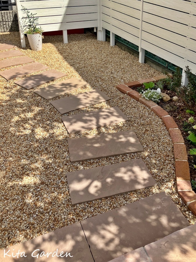 さらに、インド砂岩の飛び石を配置し、庭の中を歩くのが楽しくなる小道のようなデザインに仕上げました。