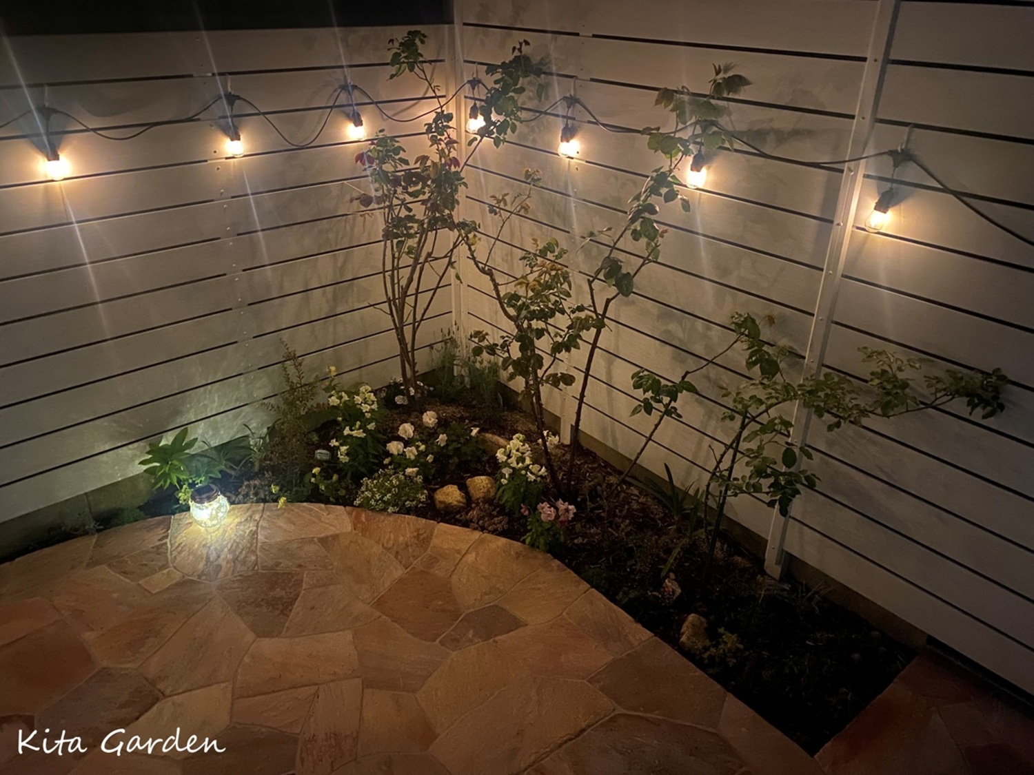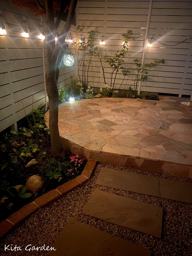 後日、フェンスに照明を取り付け、夜のお庭を楽しまれている様子のお写真をお送りいただきました。