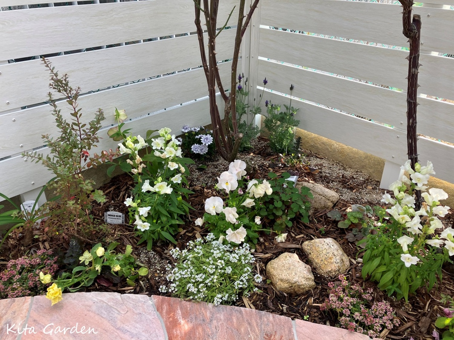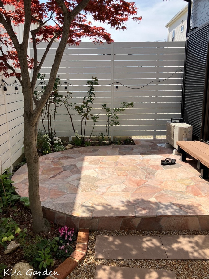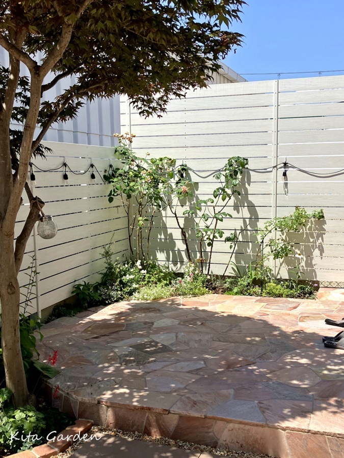 そこで、日々の手入れを抑えつつ、バラや草花が映えるように、石張りテラスを中心としたお庭へプランニング。