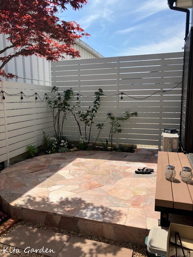 バラが映える石張りテラスの庭リフォーム|可愛く上品な洋風ガーデン | 伊丹市