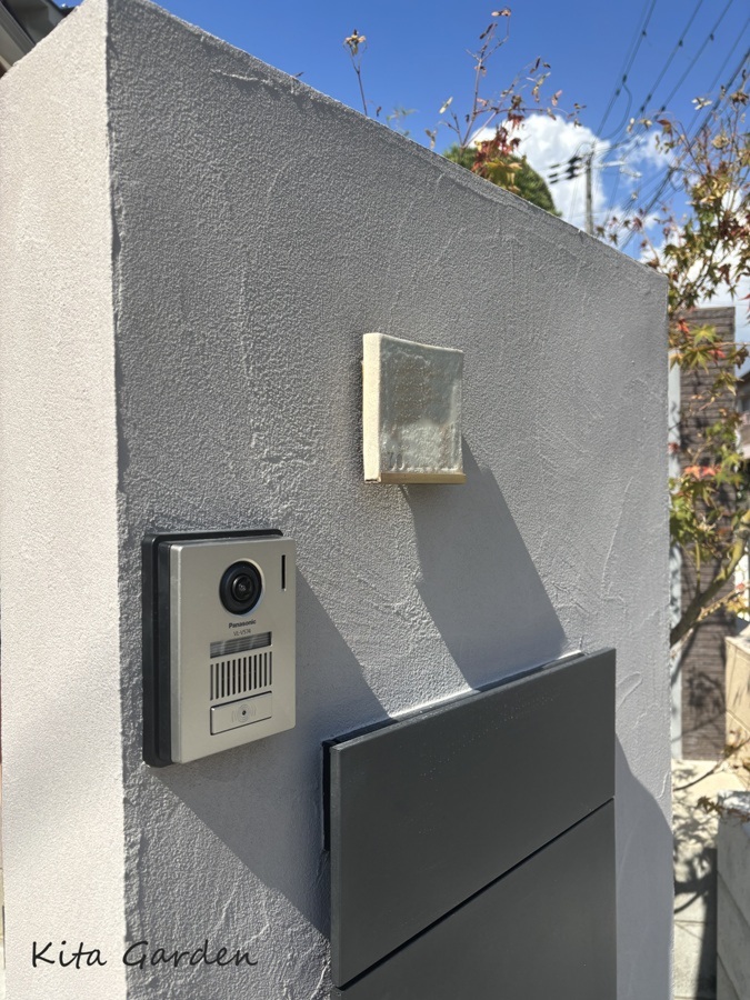 塗り壁と調和し、表札そのものが外構のアクセントとなっています。