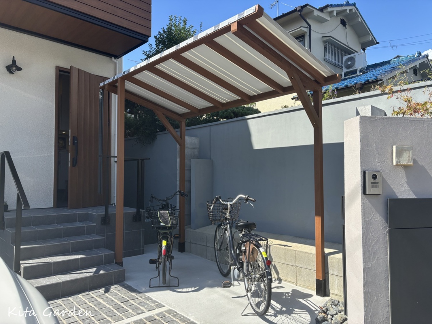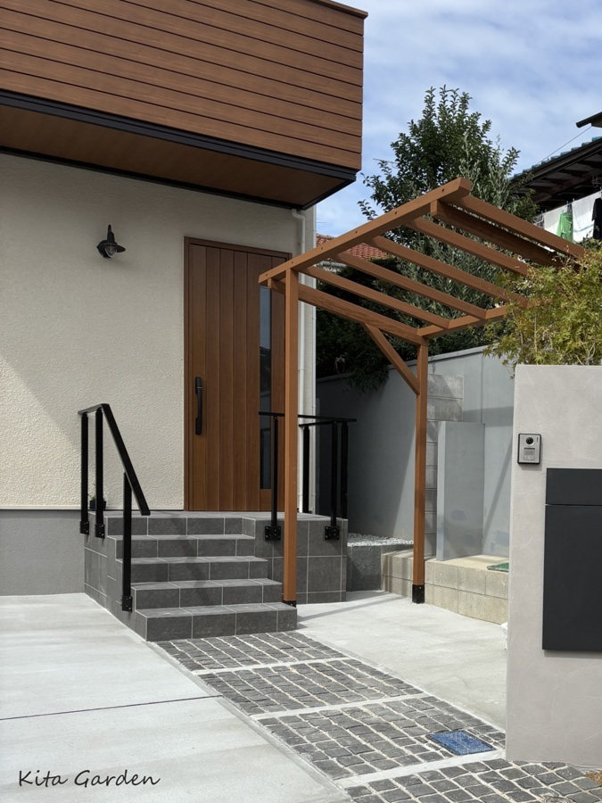 もともとの建築ポーチのままではスペースが限られ、動線が窮屈で安全面にも配慮が必要な状態だったため、