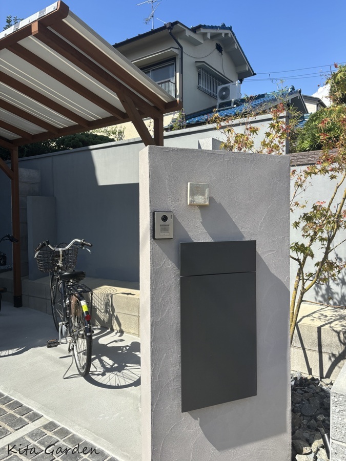 門柱はグレーベージュの塗り壁仕上げとし、落ち着いた素材感で空間に馴染むようデザインしました。