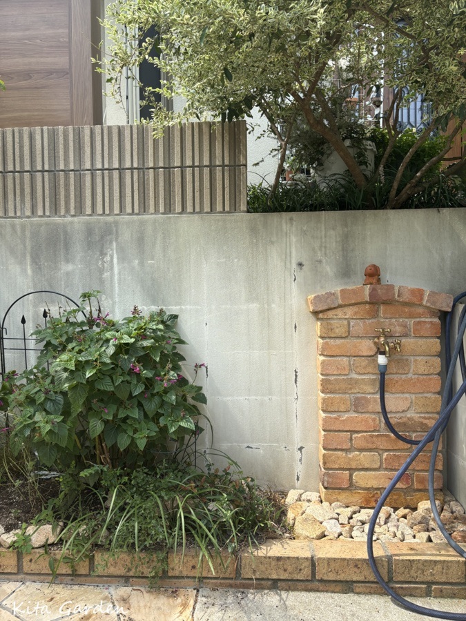 また、ガレージ奥の花壇にはアンティークレンガの立水栓を設置し、