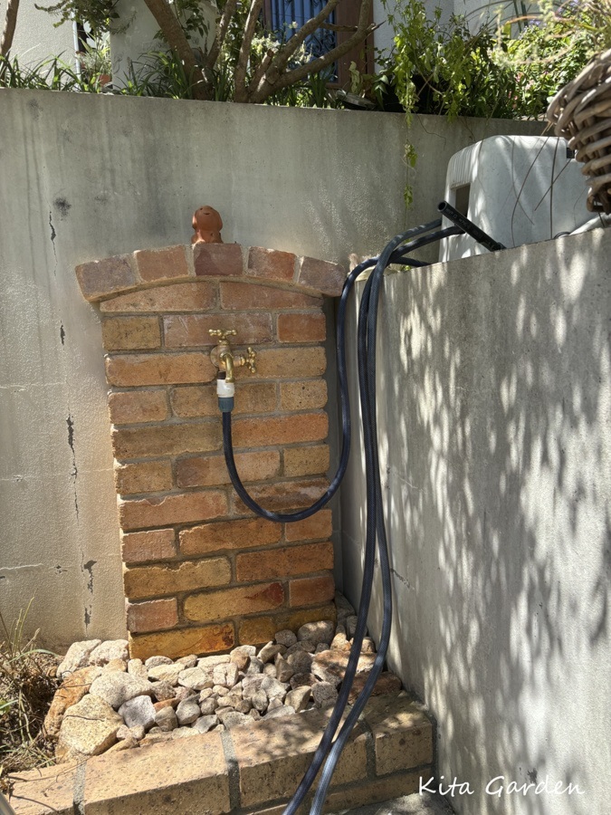 ガレージ奥の花壇に、アンティークレンガで立ち上げた可愛い立水栓スペースを新設。