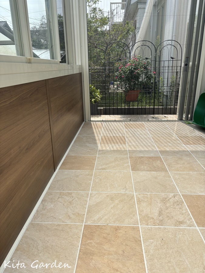 ガーデンルームの床面には、オレンジとベージュの2色を組み合わせた石調タイルを採用。